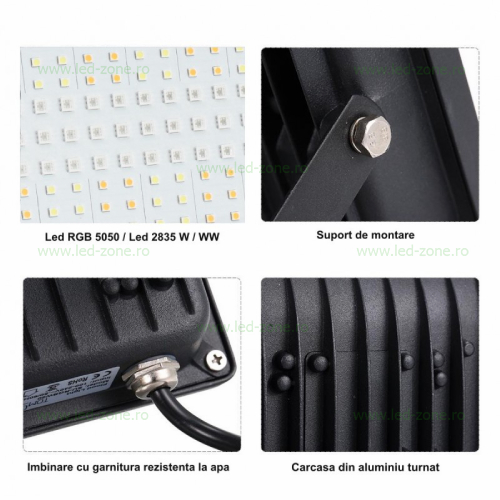 Proiector inteligent cu led RGB+CCT (2700K – 6500K), ce poate fi controlat din device-uri cu sistem de operare iOS sau Android. Acest proiector oferă pana la 16 milioane de culori și 20 de moduri de iluminat. Alimentarea proiectorului se va face la tensiunea indicată 220V. Aplicația suporta conectarea a 3-4 aparate în aplicația Android și 6-8 aparate în iOS. Din aplicatie pot fi controlate atat individual, cat si in grup. Nu funcționează cu Alexa sau Google Home. Contine suport de prindere din metal cu marja de reglare. Poate fi utilizat atât la interior cât și la exterior, acesta având un grad de protecție IP66.