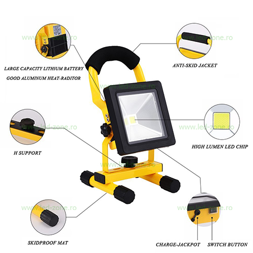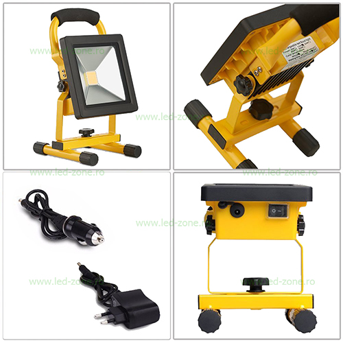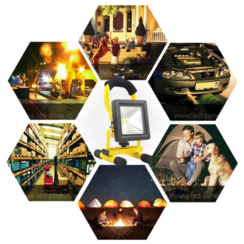 Proiectorul LED portabil cu acumulator si suport este ideal pentru iluminatul in locuri fara surse de alimentare la 220V (camping, plimbari in aer liber, pescuit, subsoluri etc.)