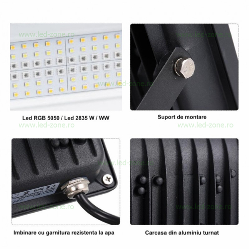 Proiector inteligent cu led RGB+CCT (2700K – 6500K), ce poate fi controlat din device-uri cu sistem de operare iOS sau Android. Acest proiector oferă pana la 16 milioane de culori și 20 de moduri de iluminat. Alimentarea proiectorului se va face la tensiunea indicată 220V. Aplicația suporta conectarea a 3-4 aparate în aplicația Android și 6-8 aparate în iOS. Din aplicatie pot fi controlate atat individual, cat si in grup. Nu funcționează cu Alexa sau Google Home. Contine suport de prindere din metal cu marja de reglare. Poate fi utilizat atât la interior cât și la exterior, acesta având un grad de protecție IP66.