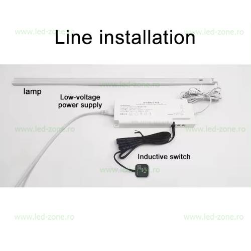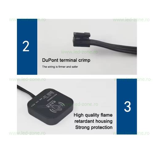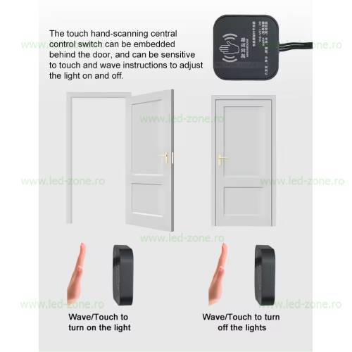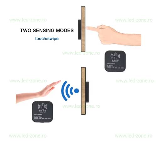 Senzorul miscare mana si tactil cu variator permite atat aprinderea, stingerea benzii LED la o simpla atingere cat si modificarea intensitatii luminoase, la o apasare indelungata a butonului, intre 5-100%.