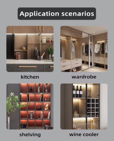 Senzorul miscare mana si tactil cu variator se foloseste in aplicatii de interior, pentru controlul benzilor de iluminat cu LED sau a altor surse de iluminat cu LED: mobila, dulapuri, rafturi, sertare, vitrine etc.