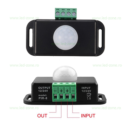 Senzorul functioneaza doar in conditii de luminozitate foarte scazuta (noaptea). Senzor cu alimentare pe 12V cu reglaj al detectiei de timp cuprins intre 1-10 minute. Se monteaza aplicat. Unghiul de detectie al senzorului este de 120 grade pe o distanta de maxim 8m. Alimenteaza consumatori de maxim 6A (12-24V).