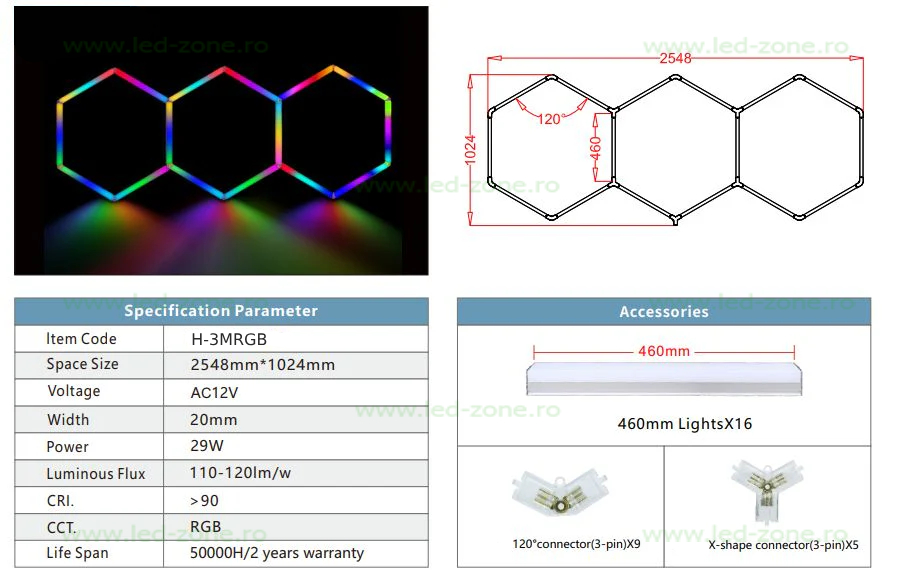 Specificatii Set 3 Hexagoane LED Honeycomb RGB Digitale Tuburi 460mm