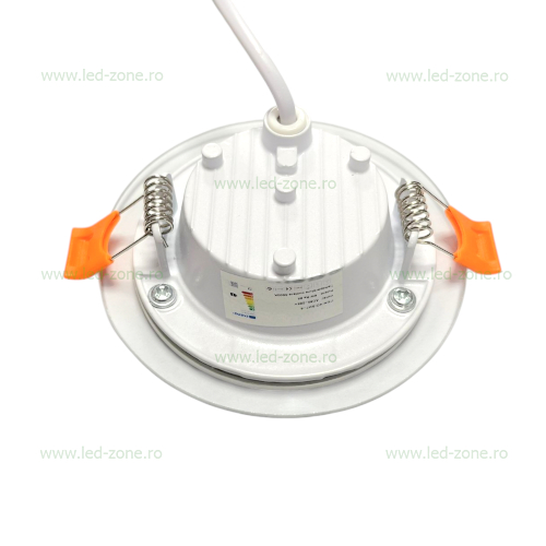 Alimentarea se face la 220V, transformatorul fiind inclus. Constructia din sticla si aluminiu asigura o durata lunga de viata, de peste 30.000 de ore. Se monteaza cu usurinta in decupaje de 73mm, avand un diametru total de 98mm.
