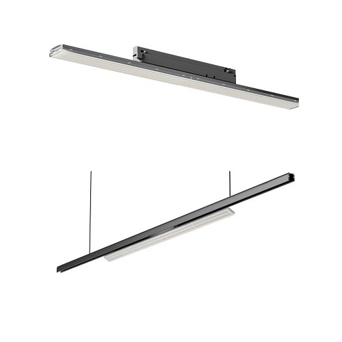 Spotul LED liniar de 55W, cu lungimea de 120 cm, este destinat montajului pe șină monofazată (cu 2 contacte) la tensiunea de 220V.