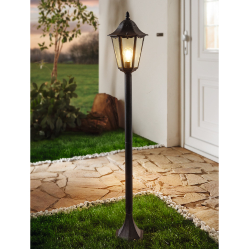 Stâlpul NAVEDO are un corp din aluminiu turnat cu un finisaj negru și argintiu patinat, cu geamuri din sticlă transparentă. Stâlpul NAVEDO este potrivit pentru utilizare în exterior datorită protecției sale IP44 împotriva stropirii apei. Produsul are un design clasic, îmbinându-se în spații exterioare precum vile în stil tradițional sau art nouveau. Becul din imagine nu este inclus. Produsul are un suport de lampă E27 și necesită un bec E27.