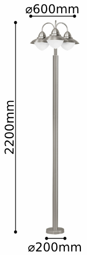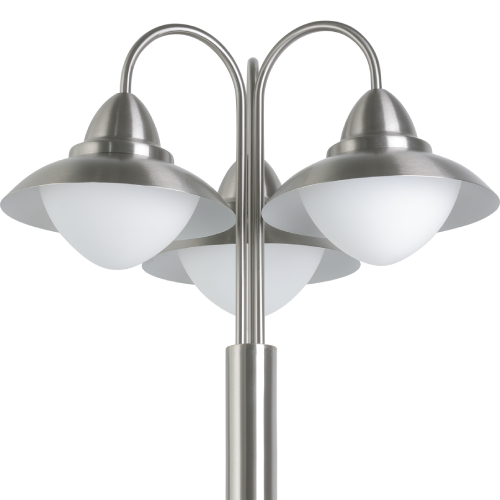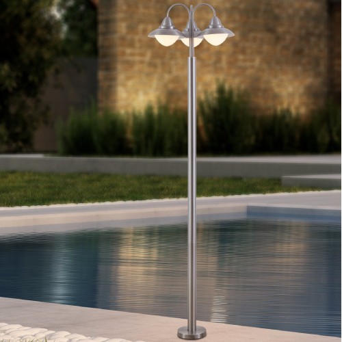 Stalpul SIDNEY are un corp din oțel inoxidabil și trei capete cu geamuri din sticlă opal mată în alb. Stalpul SIDNEY este potrivit pentru utilizare în exterior datorită protecției sale IP44 împotriva stropirii apei, iar stilul său clasic va completa frumos spațiul tău exterior. Becurile nu sunt incluse. Produsul măsoară 220 cm și are suporturi E27 care necesită becuri E27.