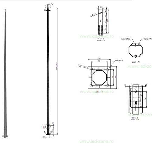 Specificatii Stalp Iluminat Octogonal Galvanizat 10M cu Flansa 200/280 2B