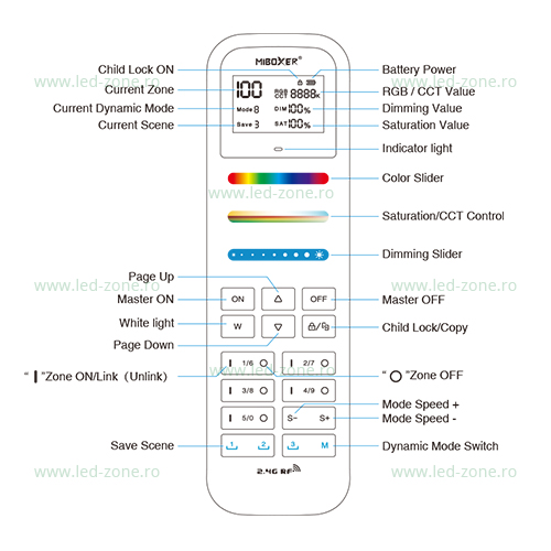 Telecomanda MiLight RF pentru luminozitate, RGB si temperatura culoare, 100 zone, suprafata tactila si butoane, baterii 2xAAA, distanta max 30m.