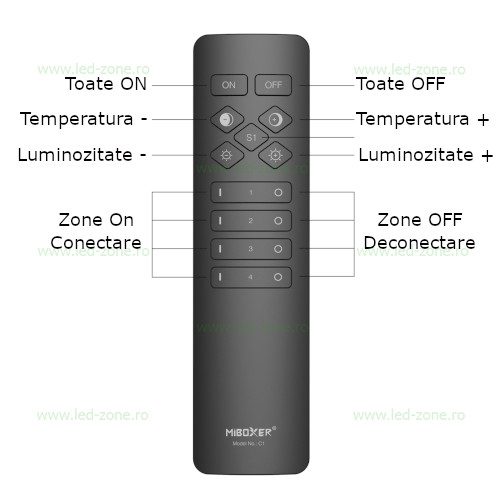 Design intuitiv și ușor de utilizat: Telecomanda este ușor de configurat și de utilizat, având un design ergonomic și butoane clare pentru ajustarea ușoară a iluminatului.