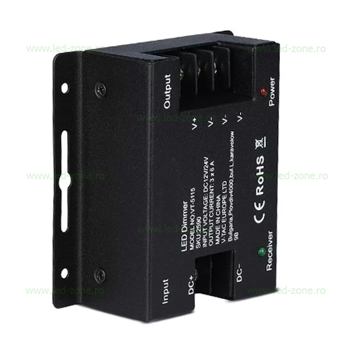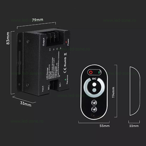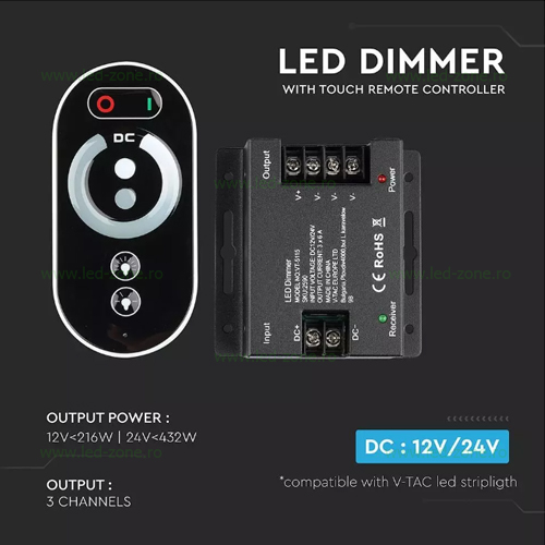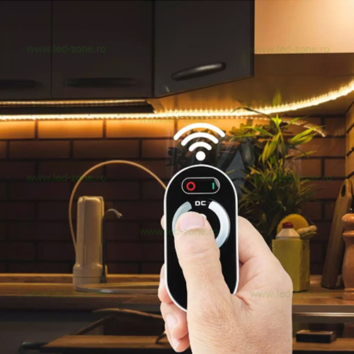 Variatorul (dimmerul) se foloseste in circuite de benzi LED cu o singura culoare. Variatorul permite reglarea intensitatii luminii benzilor LED cu putere maxima 216W (12V) sau 432W (24V) cu ajutorul telecomenzii (control prin atingere). Distanta max. control telecomanda radio frecventa: 30m.