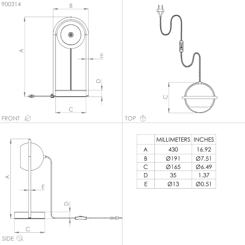Veioză MURNIA 900314, H430 mm, E14, 1X40W, IP20, oțel negru, alb